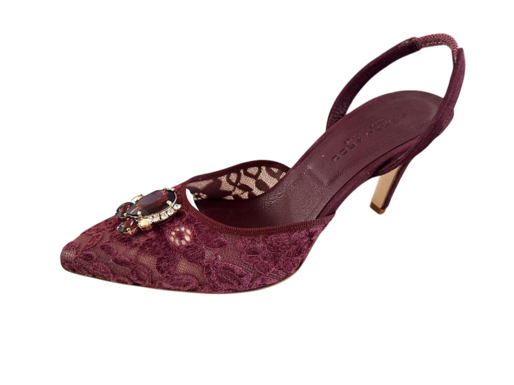 Bordeaux tulle lace sling back featuring our signature gem.Finished on a stiletto high heel.